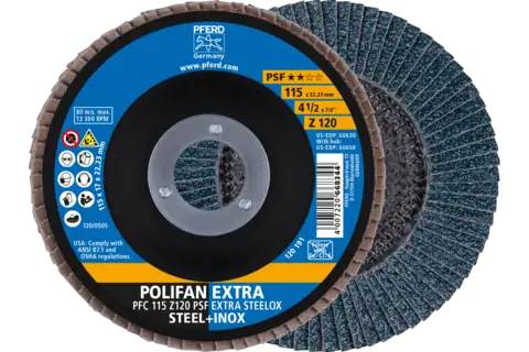 PFERD 60462 Flap Disc, 4-1/2" x 7/8, Z PSF EXTRA STEELOX, 120 Grit, T27, Flat, Zirconia