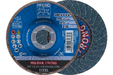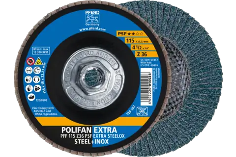 PFERD 60485 Flap Disc, 4-1/2" x 5/8-11, Z PSF EXTRA STEELOX, 36 Grit, T27, Flat, Zirconia