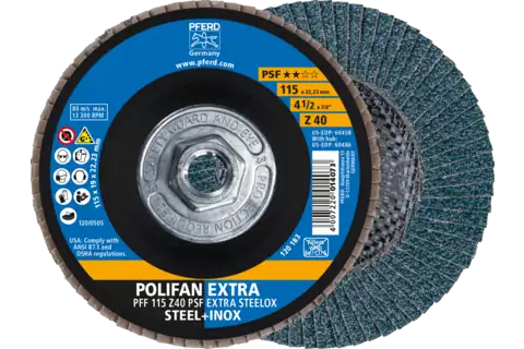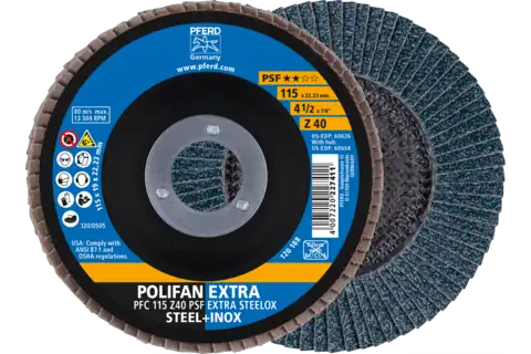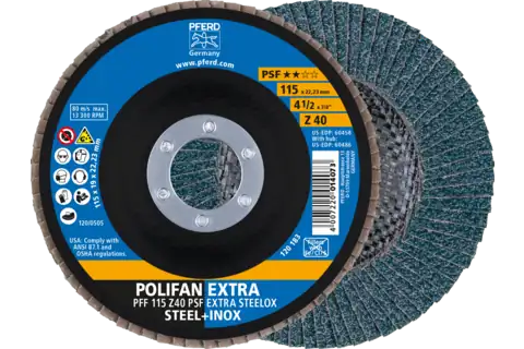 PFERD 60486 Flap Disc, 4-1/2" x 5/8-11, Z PSF EXTRA STEELOX, 40 Grit, T27, Flat, Zirconia