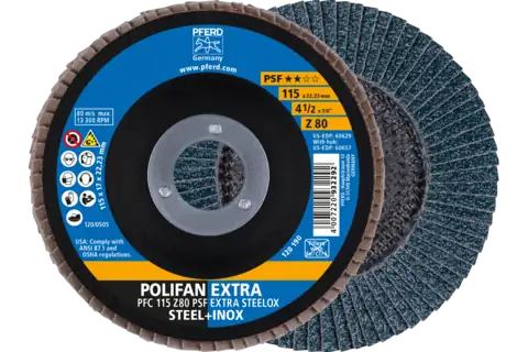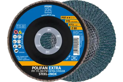 PFERD 60461 Flap Disc, 4-1/2" x 7/8, Z PSF EXTRA STEELOX, 80 Grit, T27, Flat, Zirconia