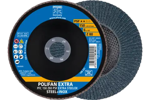 PFERD 60643 Flap Disc, 6" x 7/8, Z PSF EXTRA STEELOX, 80 Grit, T29, Conical, Zirconia