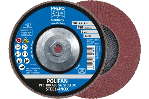 PFERD 62310 Flap Disc, 7" x 5/8-11, A SG STEELOX, 80 Grit, T29, Conical, Aluminum oxide