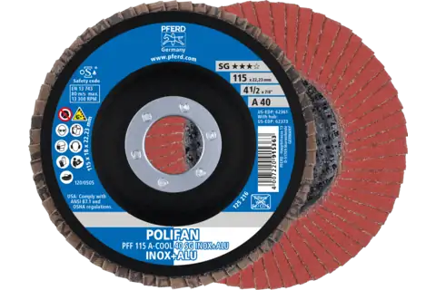 PFERD 62361 Flap Disc, 4-1/2" x 7/8, A-COOL SG INOX+ALU, 40 Grit, T27, Flat, Aluminum oxide