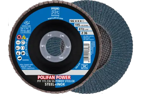 PFERD 62173 Flap Disc, 4-1/2" x 7/8, Z SG POWER STEELOX, 36 Grit, T27, Flat, Aluminum oxide