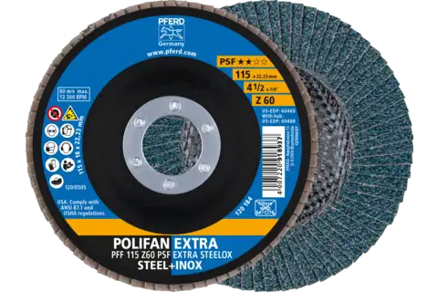 PFERD 60460 Flap Disc, 4-1/2" x 7/8, Z PSF EXTRA STEELOX, 60 Grit, T27, Flat, Zirconia