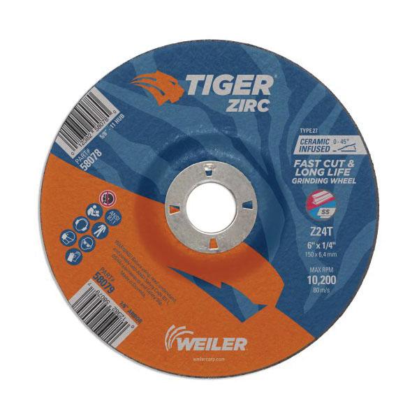 Tiger 58079 Performance Line Depressed Center Grinding Wheel, 6 in Dia x 1/4 in THK, 7/8 in Center Hole, 24 Grit, Zirconia Alumina Abrasive