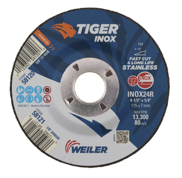 Tiger INOX 58121 Contaminant-Free Performance Line Depressed Center Grinding Wheel, 4-1/2 in Dia x 1/4 in THK, 7/8 in Center Hole, 24 Grit, White Aluminum Oxide Abrasive
