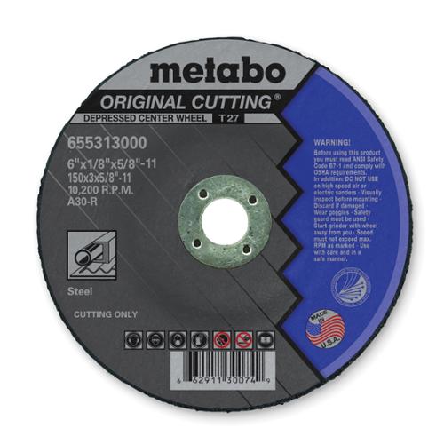 metabo Depressed Center Wheel, General Purpose, Series: Original Cutting, 6 in Wheel Diameter, 1/8 in Wheel, Thread Connector, A30R Grit, Coarse Grade, Aluminum Oxide Abrasive, Wheel Type Number: Type 27, 10200 rpm Maximum, Resin Bond, Applicable Materials: Steel and Ferrous Metals, 5/8-11 Center Hole Thread, Wheel Hardness: R, Reinforced: Yes