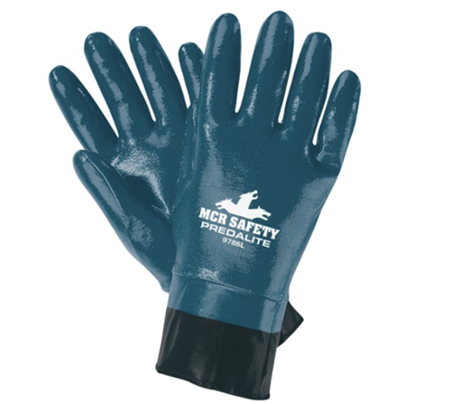 MCR Safety General Purpose Gloves, Premium Grade Single Dipped Supported, Series: Predalite 9786, Coated Glove, L, Nitrile Palm, Nitrile, Blue, Standard Finger/Straight Thumb, Interlock, Safety Cuff, Nitrile, Coating Coverage: Full Coverage, 10.862 in Length, Resists: Abrasion, Cut, Puncture, Snag and Tear