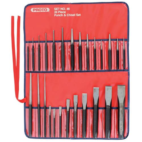Proto Punch and Chisel Set, 1/4 to 1-3/16 in Chisel, 3/32 to 1/2 in Punch, 10 in Overall Length, 17 Punches, 9 Chisels, 26 Piece, Pin/Starting/Center/Prick/Drift/Cold Style, J25TR21C 26 Pockets Tool Roll Canvas Tool Pouch, J86A1/2S2 Cold Chisel, J86A1/4S2 Cold Chisel, J86A1X8S2 Cold Chisel, J86A3/16S2 Cold Chisel, J86A3/4X8S2 Cold Chisel, J86A5/16S2 Cold Chisel, J86A5/8S2 Cold Chisel, J86A7/16S2 Cold Chisel, J86A7/8X8S2 Cold Chisel, J411/2S2 Center Punch, J413/8S2 Center Punch, J445/16S2 Prick Punch, J471/2X1/4 Pin Punch, J471/4X3/32 Pin Punch, J473/8X3/16 Pin Punch, J475/16X1/8 Pin Punch, J475/16X5/32 Pin Punch, J477/16X7/32 Pin Punch, J501/2S2 Starting Punch, J501/4S2 Starting Punch, J503/8S2 Starting Punch, J505/16S2 Starting Punch, J507/16S2 Starting Punch, J961/2S2 Drift Punch, J963/8S2 Drift Punch and J965/16S2 Drift Punch Set Contents, Yes Corrosion-Resistant, S2 Steel, Black Oxide