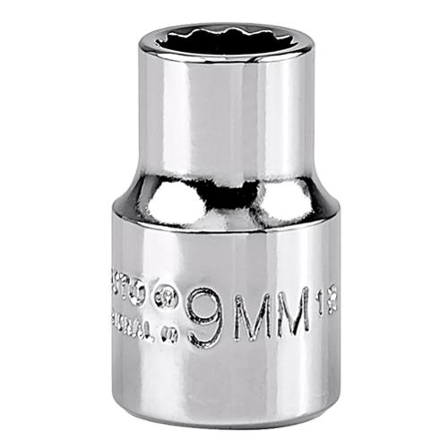 Proto TorquePlus Socket, Standard Length, No Impact Rated, Measurement System: Metric, Square Drive, 3/8 in Drive, 9 mm Socket, 27.8 mm Overall Length, 7 mm Opening Depth, 17 mm Drive End Width, 12.9 mm Socket End Width, Ball Locking, 12 Points, 17.8 mm Bolt Clearance Depth, Alloy Steel, Full Polished