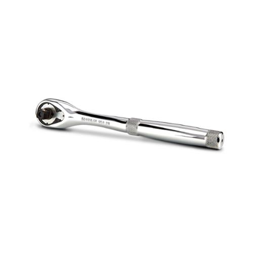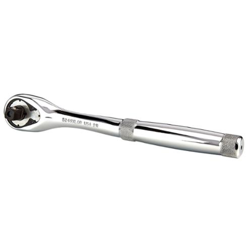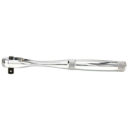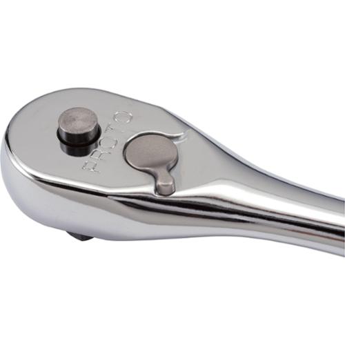 Proto Hand Ratchet, Non-Insulated, Measurement System: Imperial, 3/8 in Drive, 8-1/2 in Overall Length, Premium Pear Head Shape, 8 deg Minimum Arc Swing, 45 Geared Teeth, Ergonomic/Knurled Slip Resistant Grip Handle, Yes Quick Release Head, Specifications Met: ASME B107.10M, Yes Reversible, Steel, Full Polished