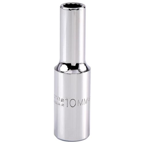 Proto TorquePlus Socket, Deep Length, No Impact Rated, Measurement System: Metric, Square Drive, 1/2 in Drive, 10 mm Socket, 82.5 mm Overall Length, 15 mm Opening Depth, 22 mm Drive End Width, 15.4 mm Socket End Width, Ball Locking, 12 Points, 66.5 mm Bolt Clearance Depth, Alloy Steel, Full Polished