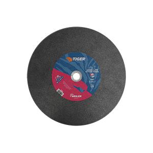 Tiger Cut-Off Wheel, Flat Large Long Life, 14 in Wheel Dia, 3/32 in, 1 in Center Hole, A36T Grit, Medium Grade, Premium Aluminum Oxide Abrasive, 4400 rpm Maximum, Resin Bond, Applicable Materials: Carbon Steel and Iron, Wheel Type Number: Type 1, Wheel Hardness: T, For Use with: Cut-Off Die Grinder, Right Angle Air Die Grinder and Right Angle Grinders, Reinforced: Yes