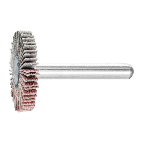 With mounted flap wheels, coated abrasive flaps are arranged radially around the core in a fan-like structure. The flexible flaps perfectly adapt to surface contours. The abrasive grain is embedded in the sturdy, flexible cloth backing material with a resinoid bond. In ISO 3919, mounted flap wheels are designated as "flap wheels with shaft." For universal applications from coarse to fine grinding.