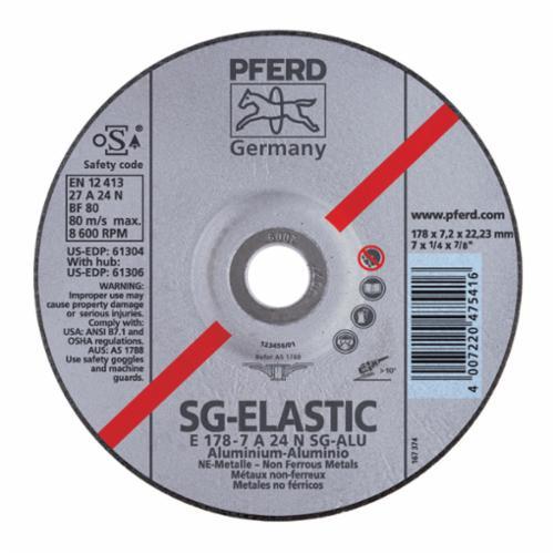 PFERD Depressed Center Wheel, Series: Performance Line SG, 4-1/2 in Wheel Dia, 1/4 in Wheel Thickness, 24 Grit, Coarse Grade, Aluminum Oxide Abrasive, Wheel Type Number: Type 27, 13300 rpm Maximum, Resin Bond, Applicable Materials: Non-Ferrous Metals, Soft, Tough and Hard Aluminum, 5/8-11 Center Hole Thread Size, Wheel Hardness: N, Yes Reinforced, ANSI Specified Specifications Met